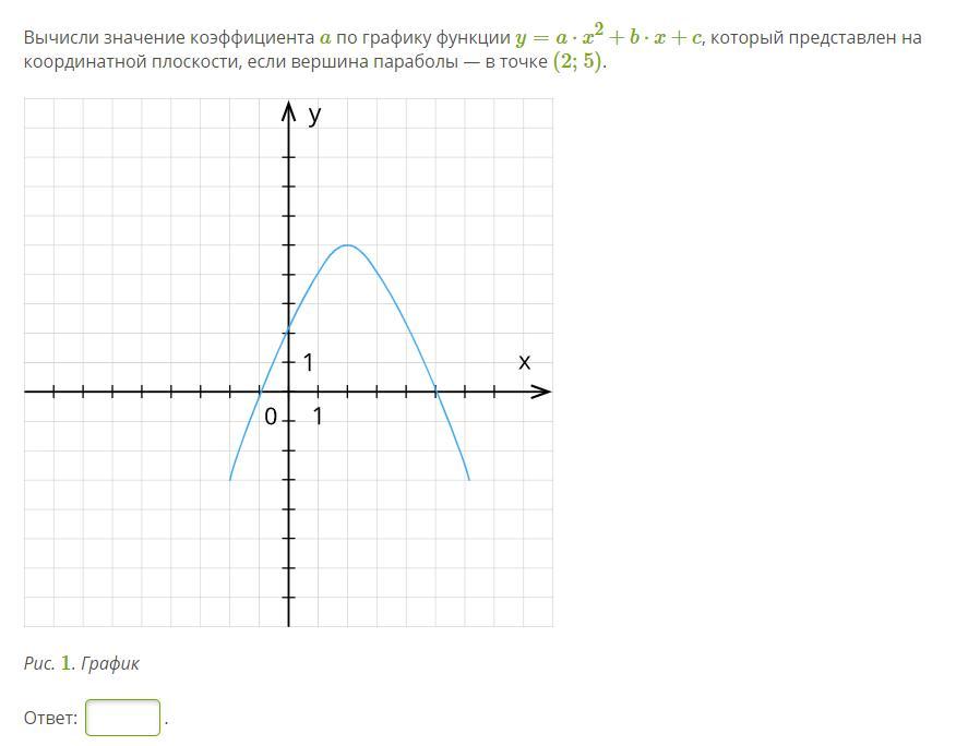 Вычисли значение коэффициента a по графику функции y=a⋅x2+b⋅x+c, который представлен на координатной плоскости, если вершина параболы — в точке (2; 5).