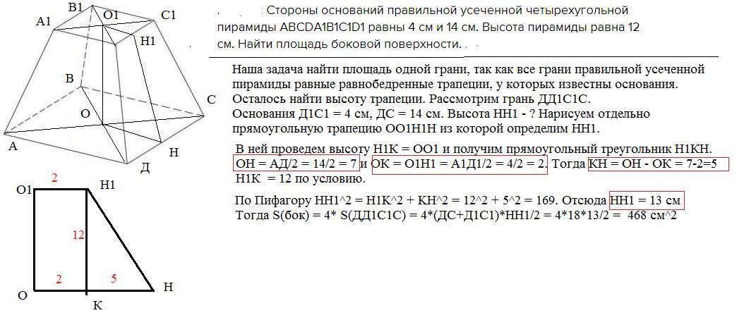 Вопрос: Стороны оснований правильной усеченной четырехугольной пирамиды ABCDA1B1C1D1 равны 4 см и 14 см. Высота пирамиды равна 12 см. Найти площадь боковой поверхности. В ответ запишите только число без единиц измерения. Например, 123.