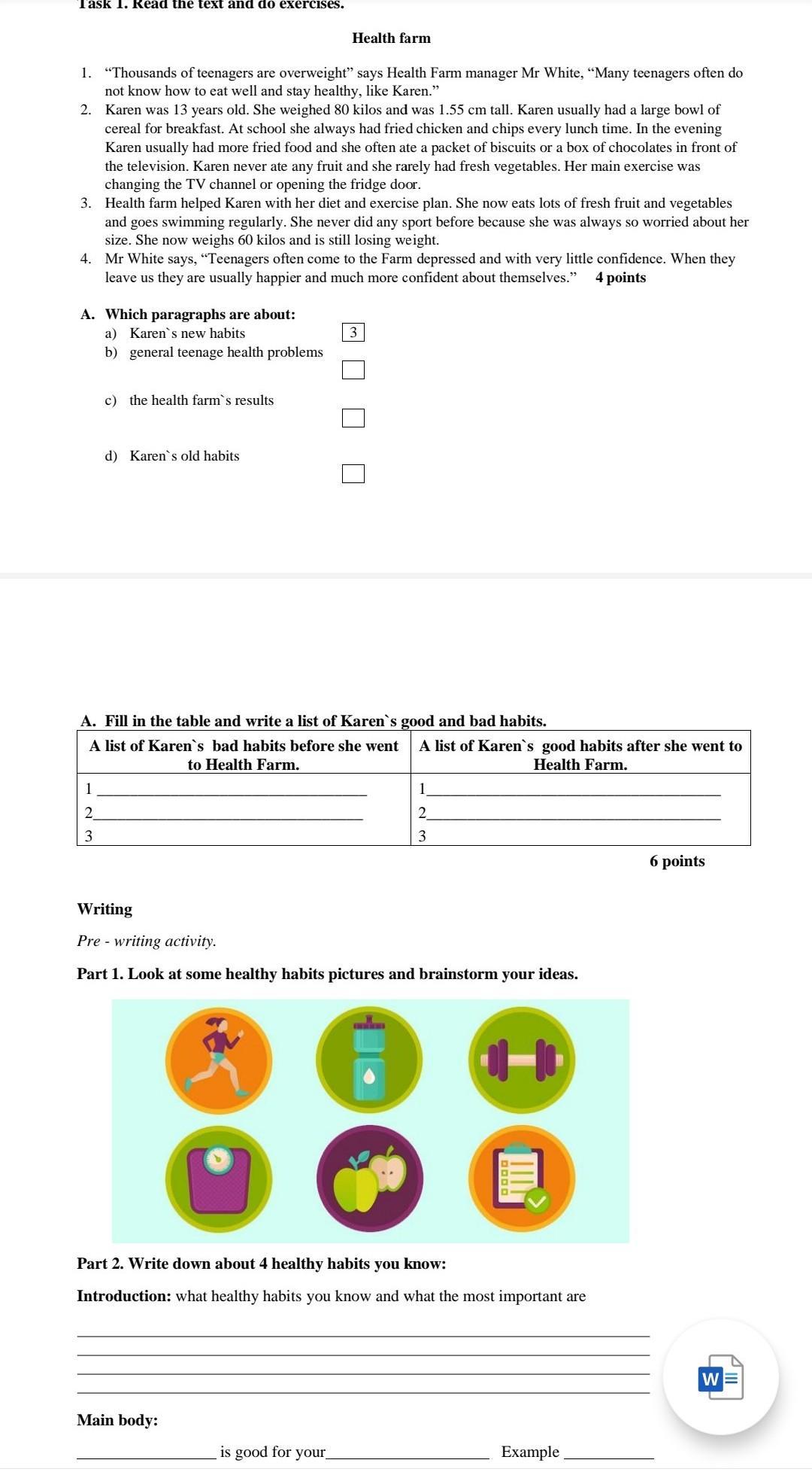 3. Health farm helped Karen with her diet and exercise plan. She now eats lots of fresh fruit and vegetables
