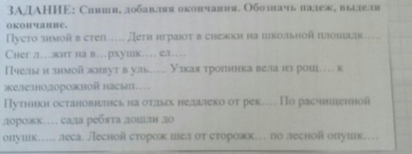 ЗАДАНИЕ: Спиши, добавляя окончания. Обозначь падеж, выдели и окончание.