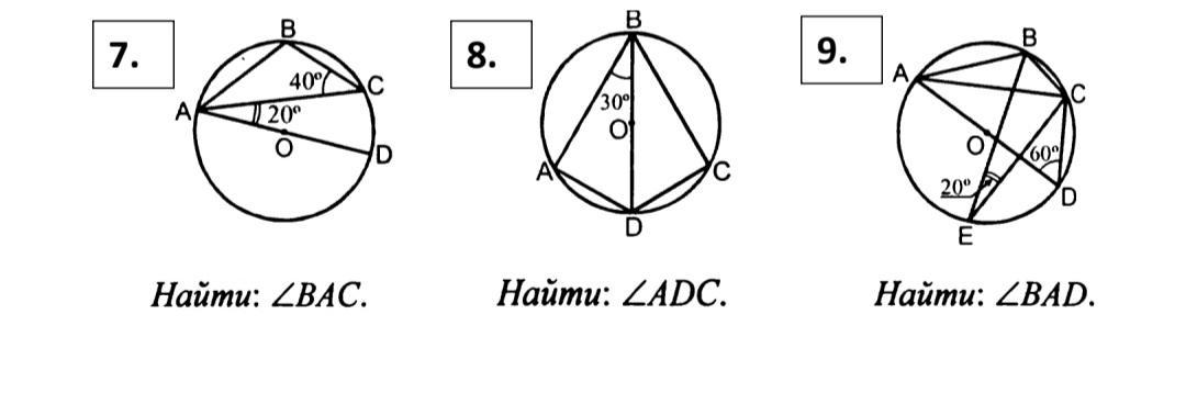 - 7. дуга AD равна 180 градусов . угол CAD вписанный угол следовательно дуга CD равна : 20 умножить на 2 равно 40. дуга AB равна : 40 умножить на 2 равно 80. угол BAC опирается на дугу BC. Мы эту дугу можем найти , зная чему равна большая дуга ad. AD равно AB+BC+CD. Подставим известные числа. 180 равно 80+BC+40. значит BC равно 60 градусов. так как BAC это вписанный угол значит 60 разделить на 2 равно 30 градусов