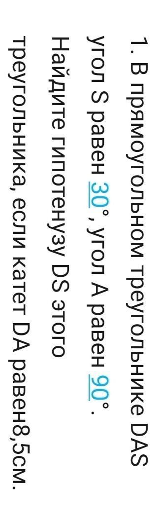 Ответ:Катет DA лежит против угла З0 градусов,поэтому гипотенуза DS в два раза больше катета