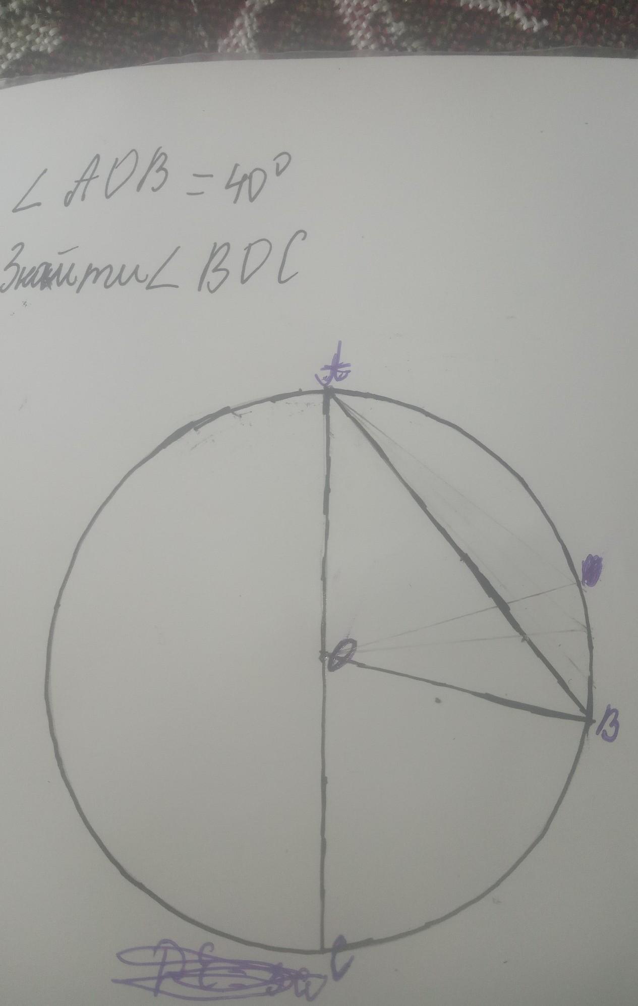 оскільки кут АОС спирається на півколо його градусна міра 180 градусів,тому кут ВОС=180-40=140 градусів