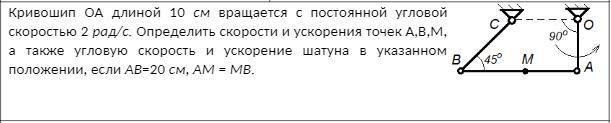 Кривошип ОА длиной 10 см вращается с постоянной угловойскоростью 2 рад/с. Определить скорости и ускорения точек А,В,М,а также угловую скорость и ускорение шатуна в указанномположении, если AB=20 см, АМ = МВ