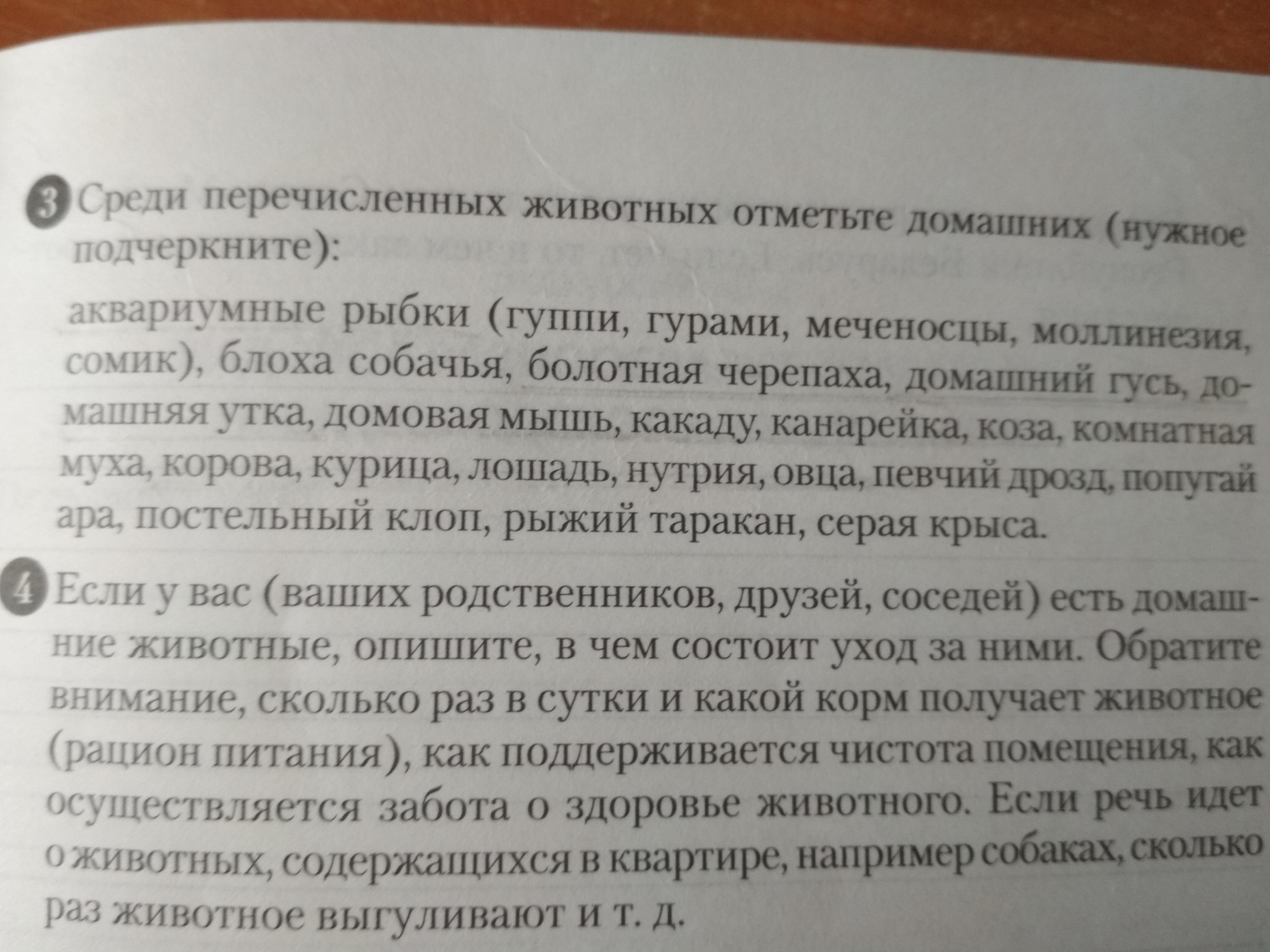 Аквариумные рыбки, домашний нусь, домашняя утка, коза,корова, курица, лошадь, овца.