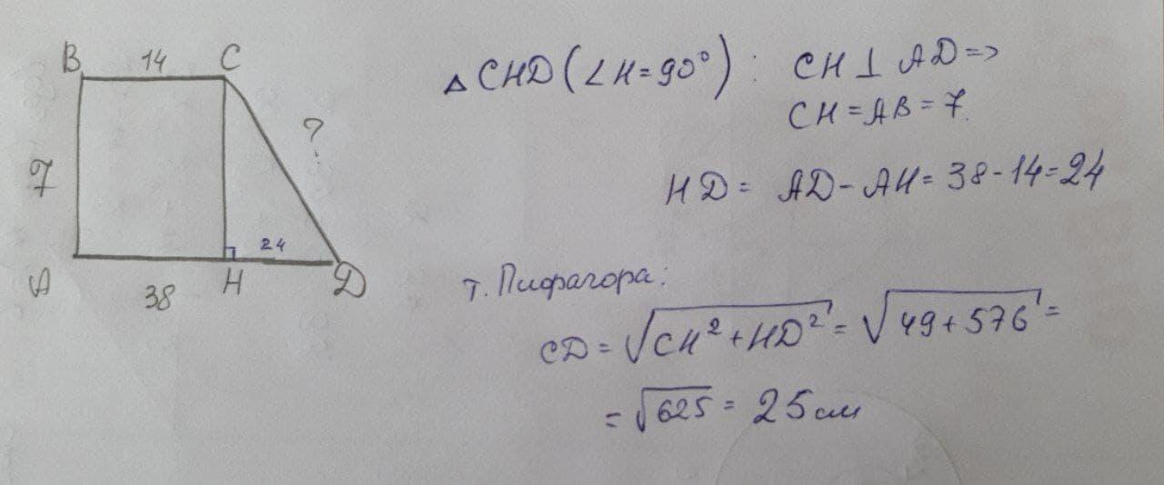 Основи прямокутної трапеції дорівнюють 14 дм і 38 дм. Менша бічна сторона дорівнює 7 дм.