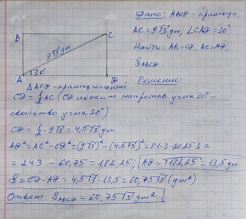 Обчисли сторони і площу прямокутника, якщо його діагональ дорівнює 9√3дм і утворює з більшою стороною кут 30 градусів.