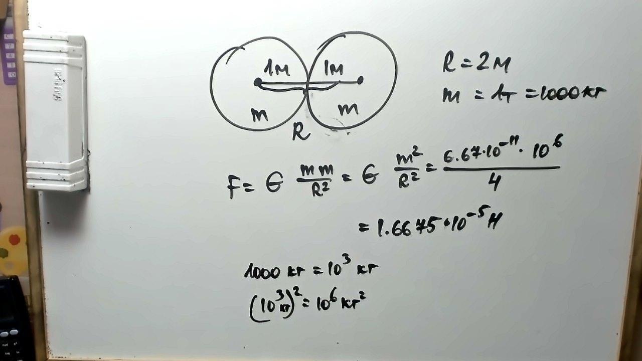 Два шара радиусами в 1м и массами в 1т соприкасаются друг с другом.Вычислите силу тяготения между шарами