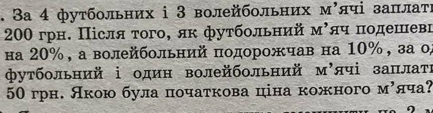 Нехай початкова ціна футбольного м‘яча х грн., а волейбольного у грн. За 4 футбольних м‘ячі заплатили 4х грн., а за 3 волейбольних - 3у грн. За умовою: