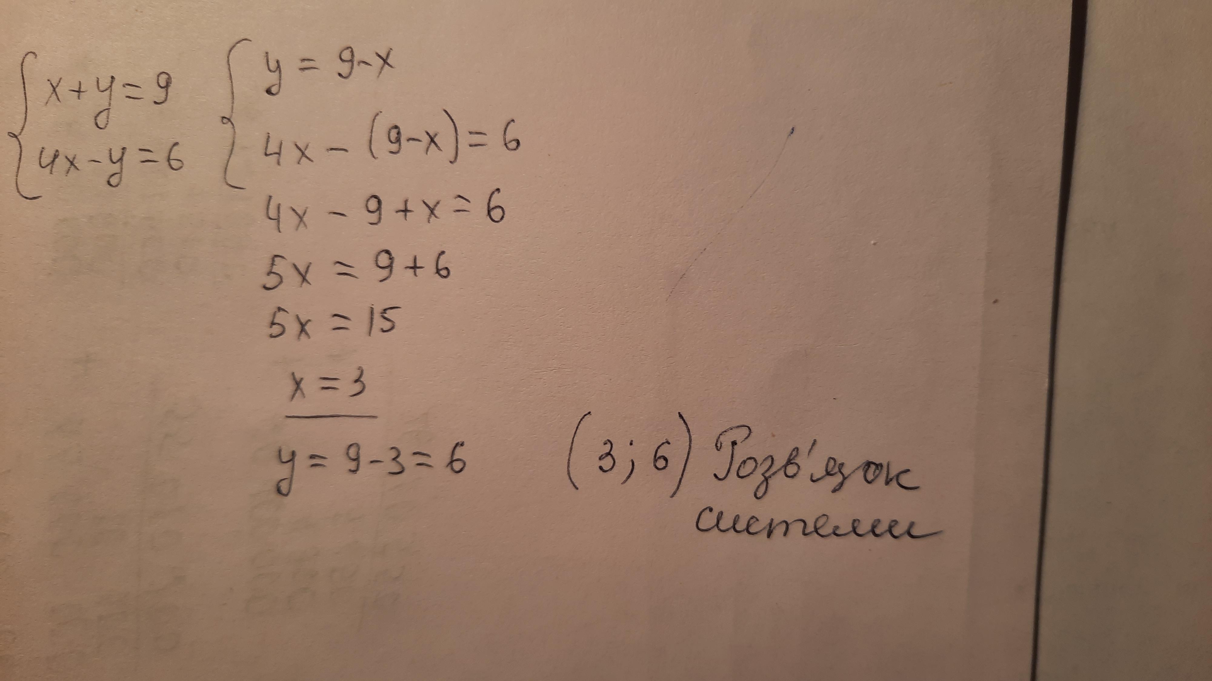 4. Яка з пар чисел є розв'язком системи рівнянь [x+y=9, |4x-y=6?