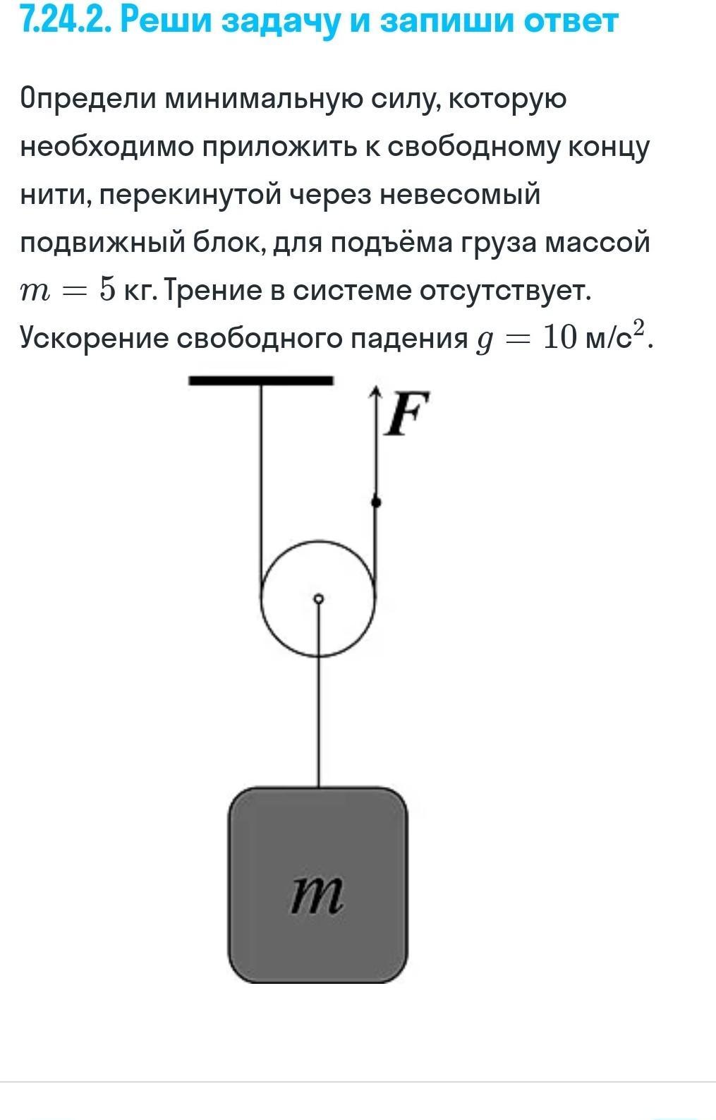 Определи минимальную силу, которую необходимо приложить к свободному концу нити, перекинутой через невесомый подвижный блок, для подъёма груза массой = 5 кг. Трение в системе отсутствует. Ускорение свободого падения =10м/с²