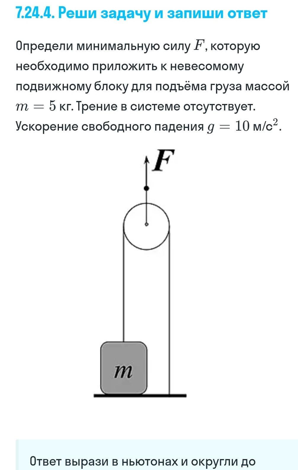 Определи минимальную силу, которую необходимо приложить к свободному концу нити, перекинутой через невесомый подвижный блок, для подъёма груза массой = 5 кг. Трение в системе отсутствует. Ускорение свободого падения =10м/с²