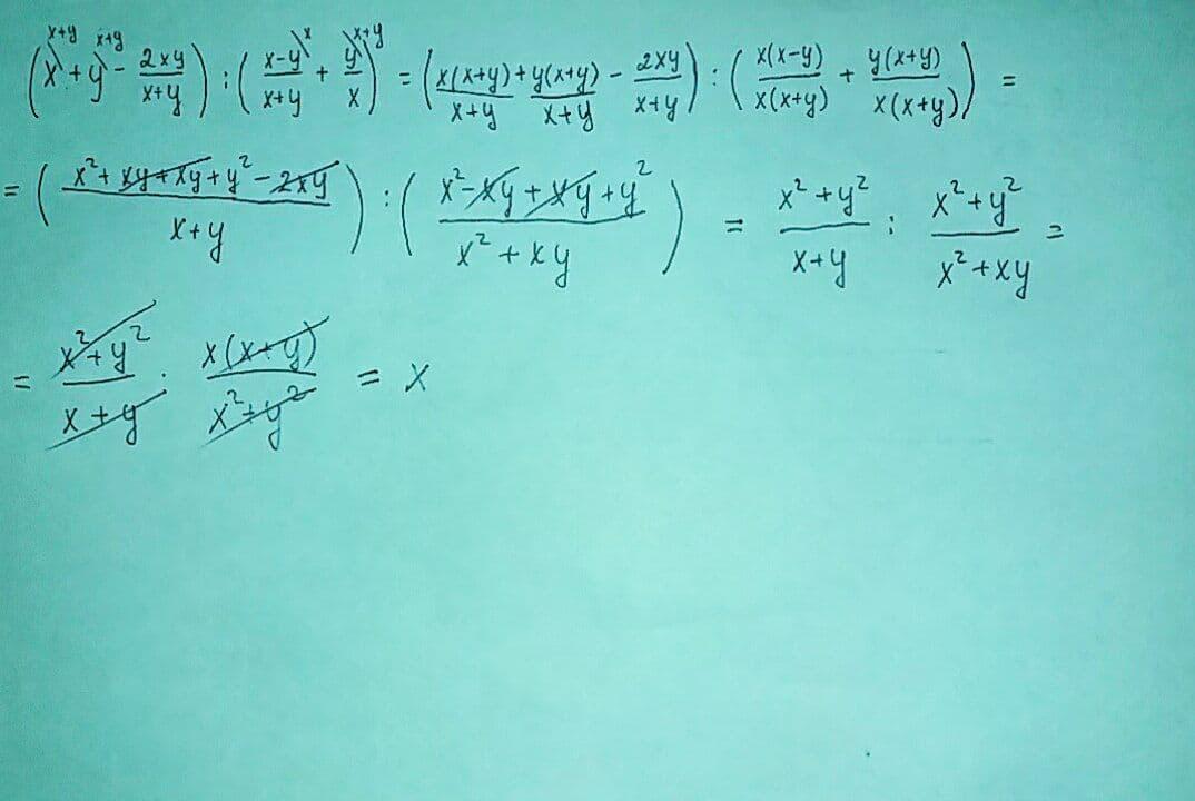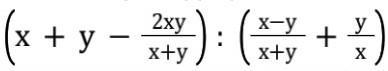 (x+y-2xy/(x+y)) : ((x-y)/(x+y)+y/x)= (x(x+y)+y(x+y)-2xy) : (x(x-y)+y(x+y))=