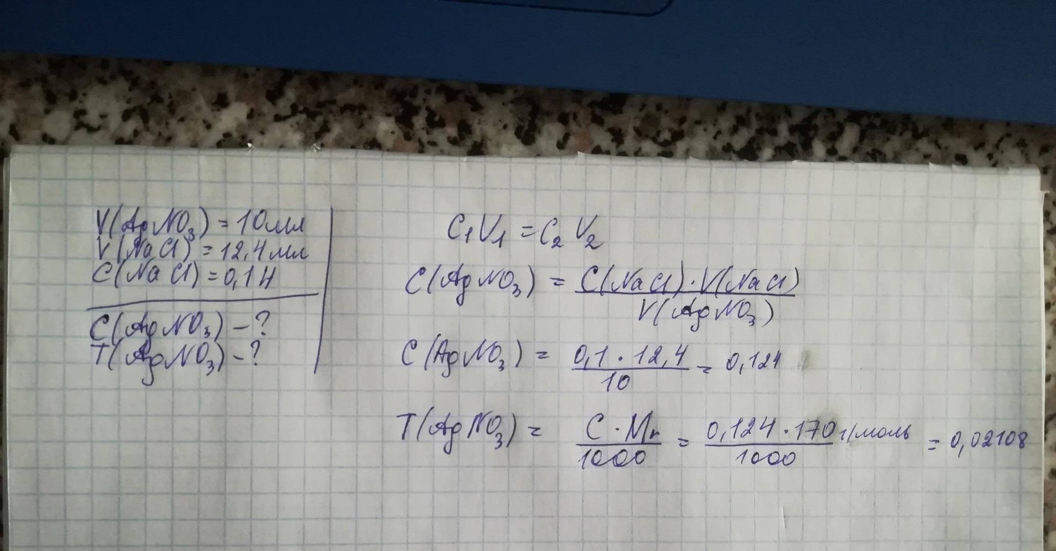 На титрование 10 мл раствора AgNO3 израсходовано 12,4 мл 0,1 н раствора NaCl. Вычислите N (AgNO3 ) и его титр.