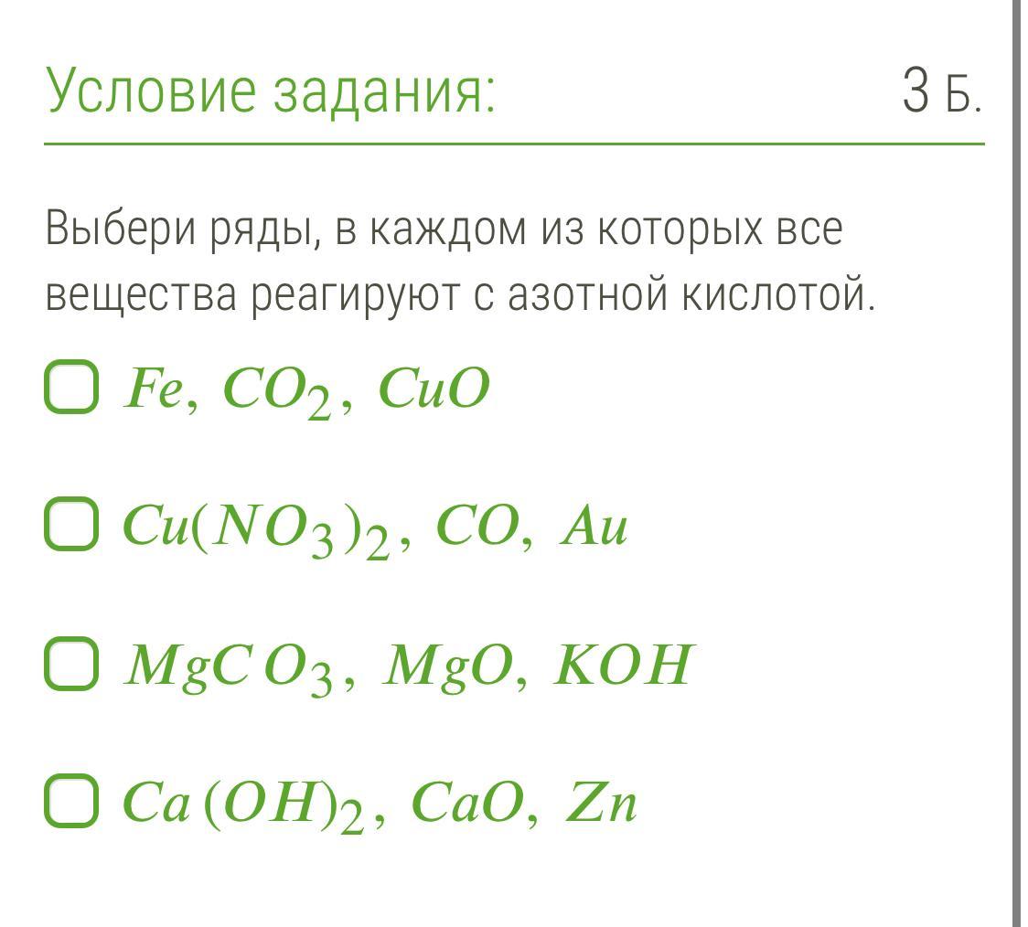 Выбери ряды, в каждом из которых все вещества реагируют с азотной кислотой.
