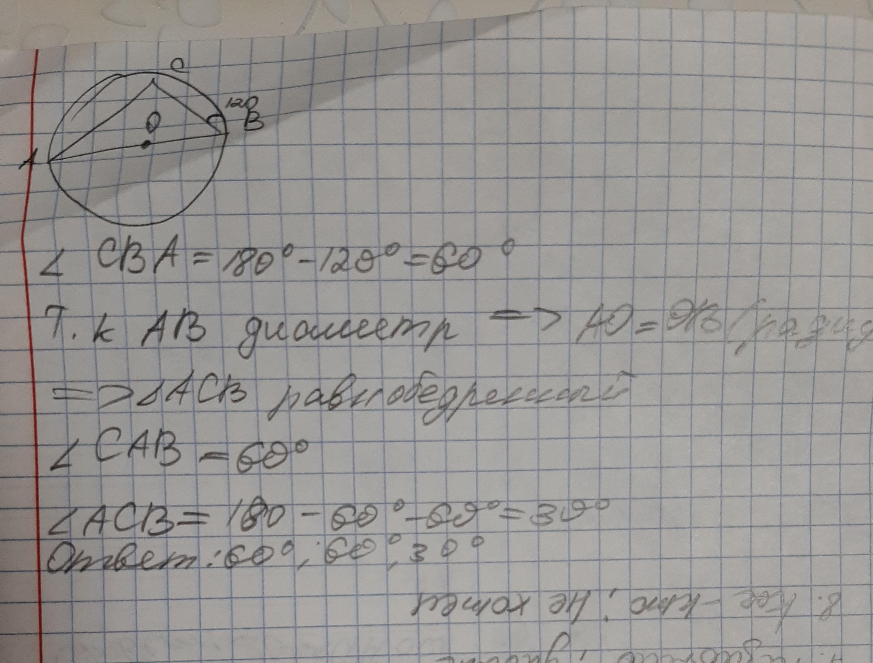 в окружность вписан треугольник ABC так, что AB - диаметр окружности. Найдите все углы треугольника, если малая дуга BC=120 градусов