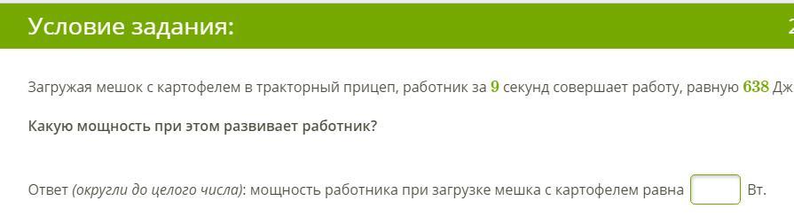 Загружая мешок с картофелем в тракторный прицеп, работник за 9 секунд совершает работу, равную 638 Дж.