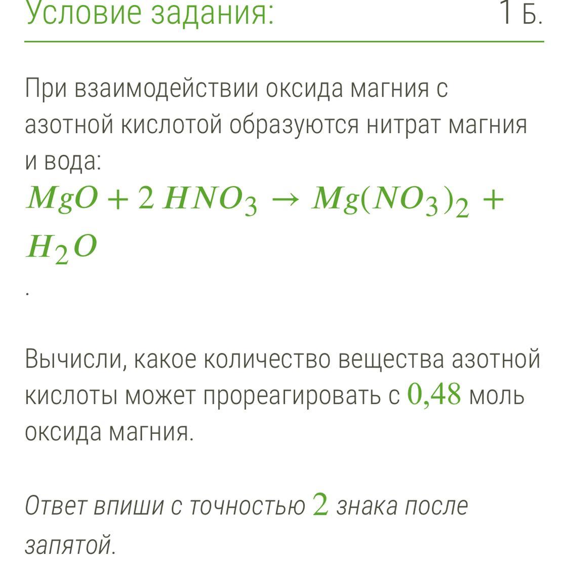 по реакции видно, что на 1 моль магния оксида тратится 2 моль азотной кислоты, на 0,48 моль оксида магния потребуется 0,48×2=0,96 моль кислоты.