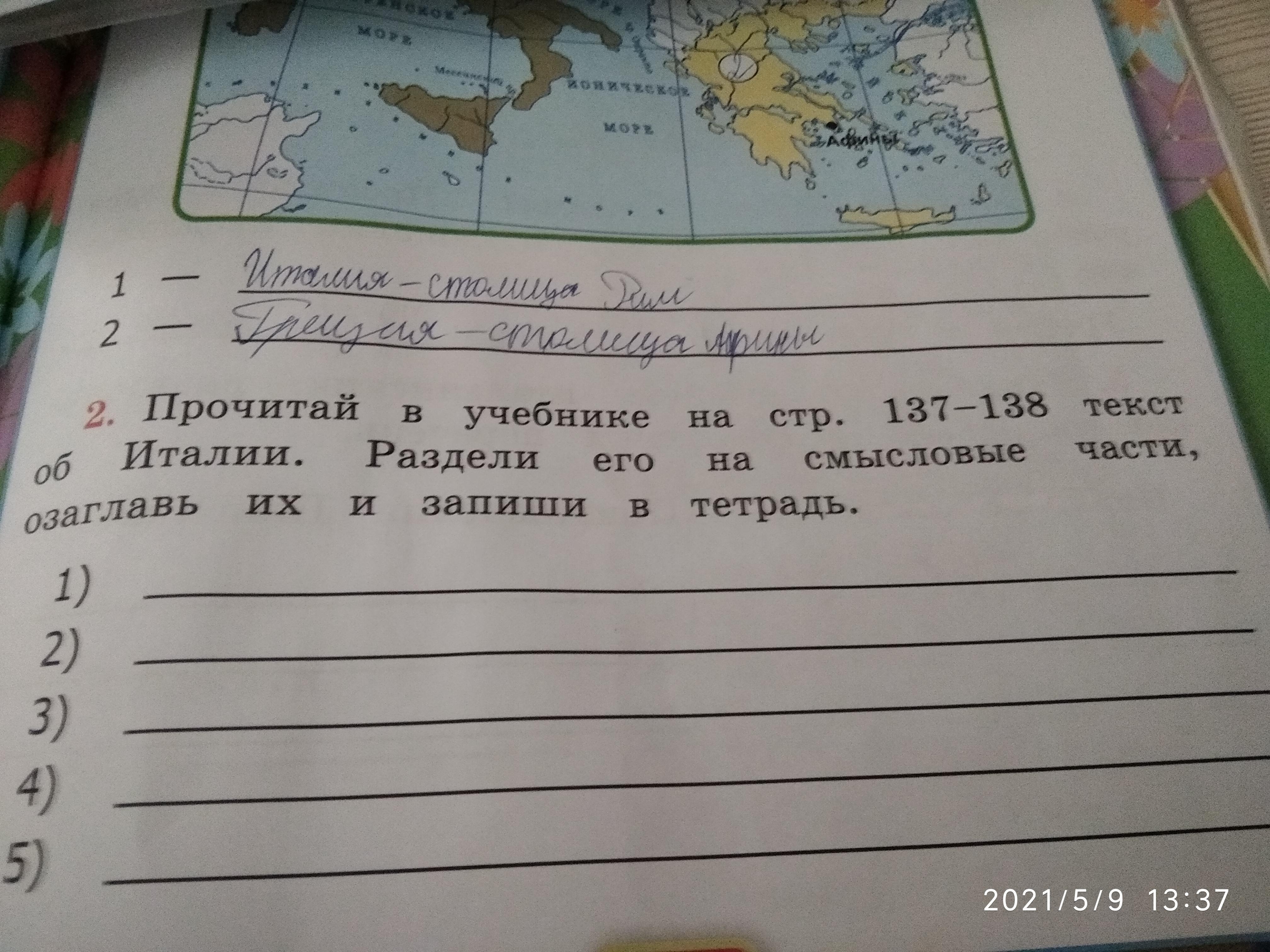 Прочитай в учебнике на стр. 137-138 текст об Италии. Раздели его на смысловые части , озаглавленный из и запиши в тетрадь.