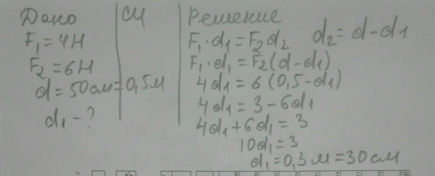 На рычаг дейтвует две силы 4 Н и 6 Н, приложенные к концам рычага. Длина всего рычага 50 см. Каким должно быть плечо меньшей силы (в см) , чтобы рычаг находился в равновесии (в ответ запишите число)?
