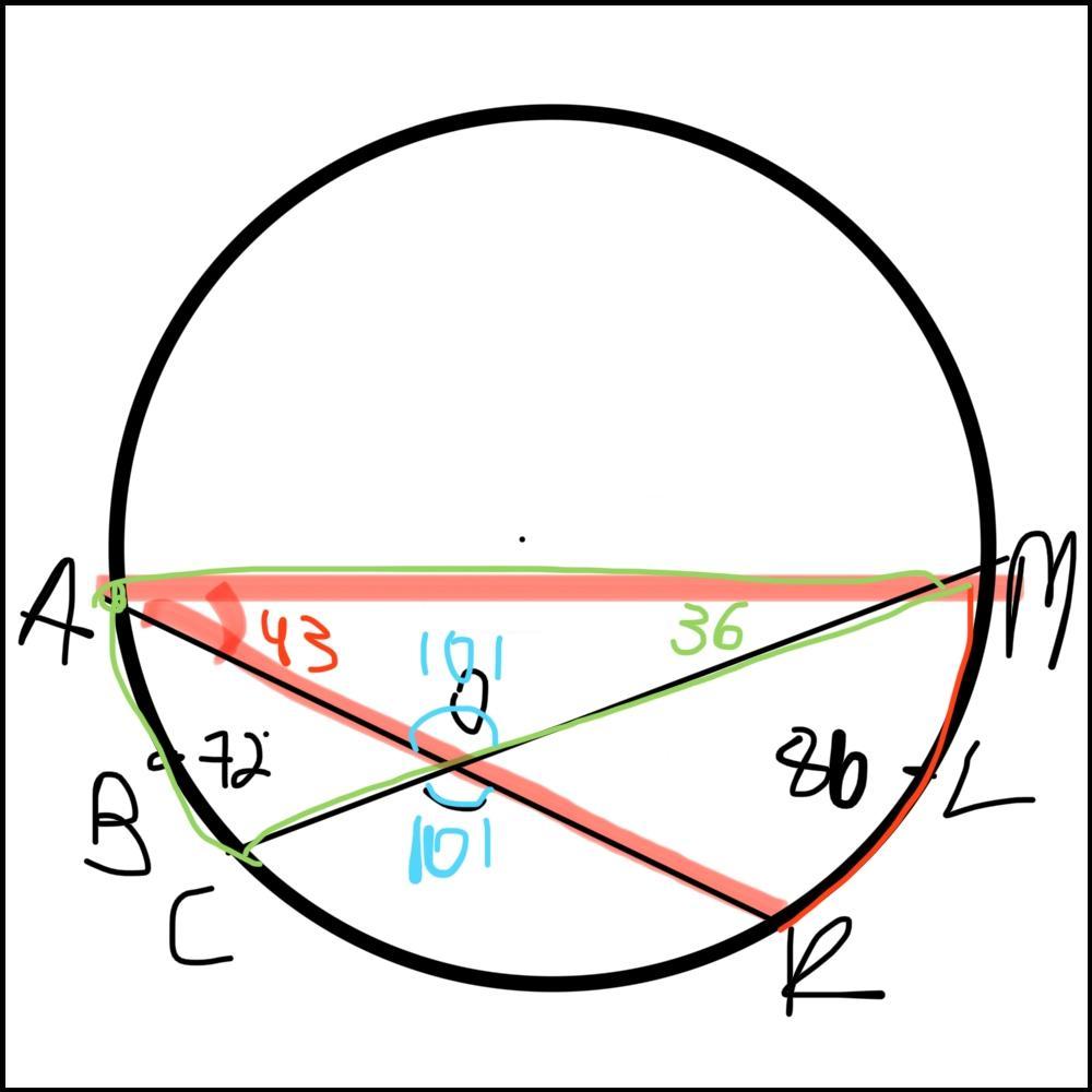 На окружности последовательно расположены точки A, B, C, K, L, M. Хорды окружности AK и CM пересекаются в точке O. Определите величину угла COK, если градусные меры дуг ABC и KLM равны 72 ∘и 86 ∘