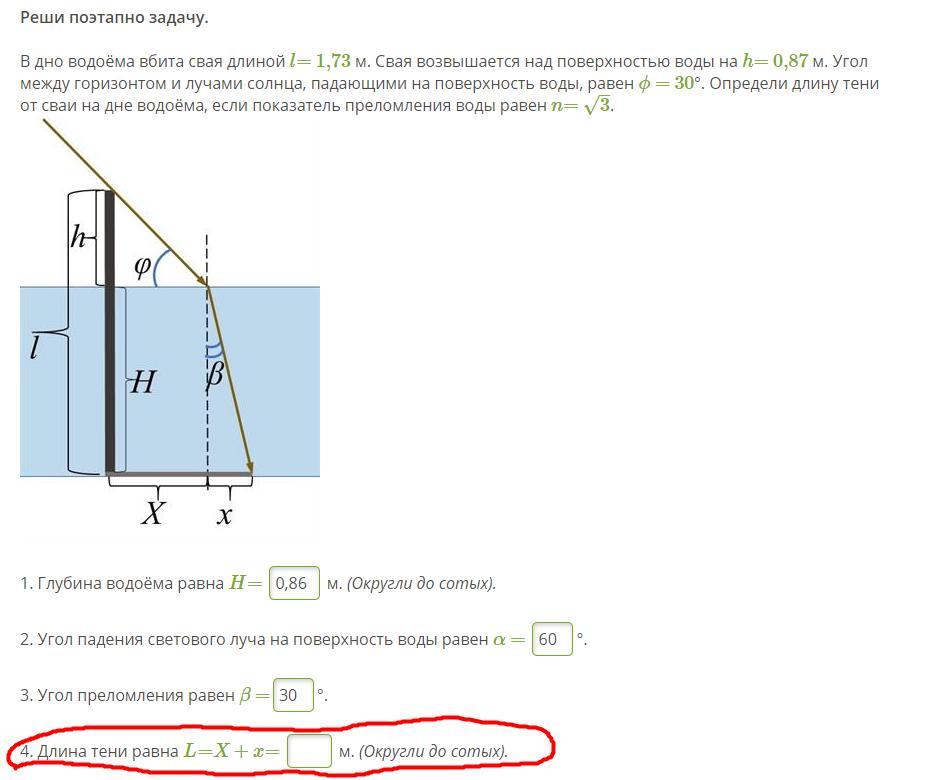 В дно водоёма вбита свая длиной l= 1,73 м. Свая возвышается над поверхностью воды на h= 0,87 м. Угол между горизонтом и лучами солнца, падающими на поверхность воды, равен ϕ = 30°. Определи длину тени от сваи на дне водоёма, если показатель преломления воды равен n= 3–√.