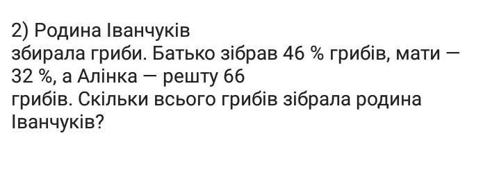 1) 100 - (46+32) = 100 -78=22 % грибів зібрала Алінка