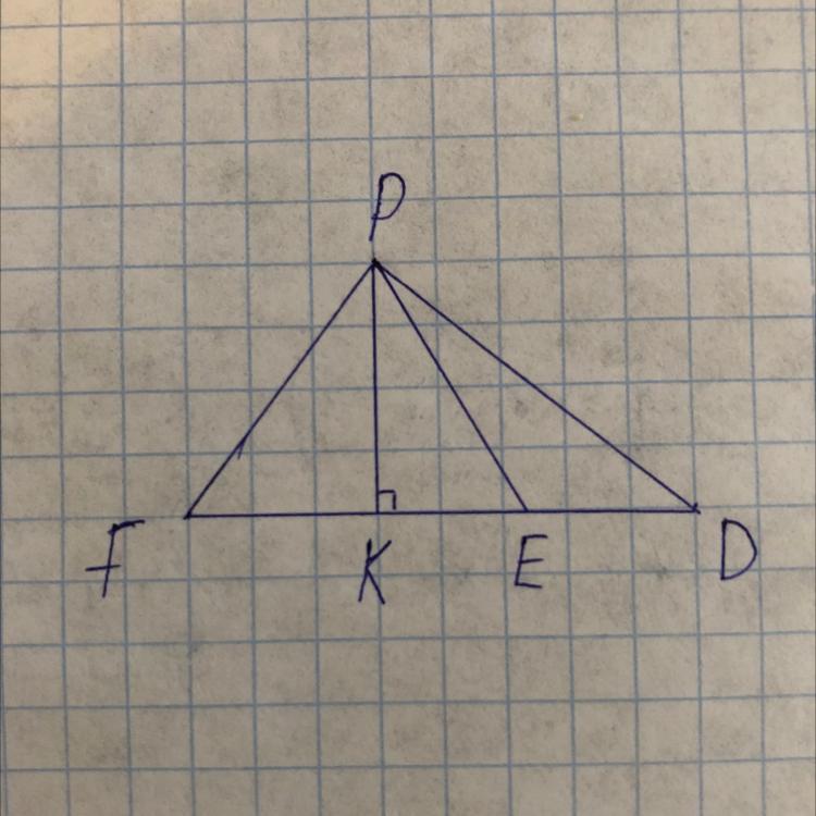 Для того чтобы доказать, что PD > PE, нужно из вершины P провести перпендикуляр, для того чтобы получить два прямоугольных треугольника PKE и PKD, для которых PE и PD будут являться гипотенузами. Далее воспользуемся теоремой Пифагора, о именно сумма квадратов катетов равна квадрату гипотенузы, соотвественно для двух треугольников катет PK - общий и остаётся сравнить второй катет этих двух треугольников. Катет KE для треугольника PKE меньше катета KD треугольника PKD, а это в свою очередь подтверждает то, что PD > PE