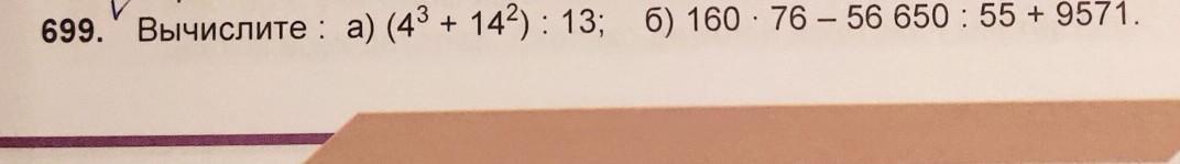 699. Вычислите : а) (43+ 142): 13; б) 160 - 76 — 56 650 : 55 + 9571.