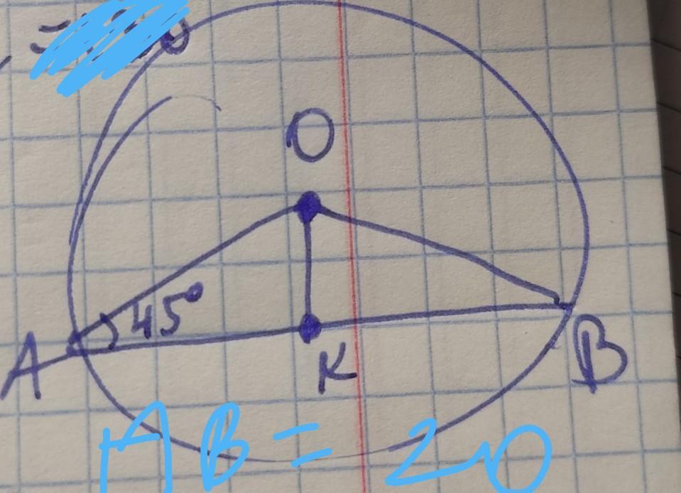 рассмотрим наш рисунок угол при основании в треугольнике oab равен 45 градусов По условию ОА и Ob это радиусы значит наш треугольник равнобедренный значит углы при его основании равны значит угол Куба тоже равен 45 градусов равнобедренном треугольнике у нас Ок является высотой и медианой и биссектрисой угла соответственно если это медиана это отрезок aк равен отрезку AB и равен AB / 2 то есть 10 и 10 теперь рассмотрим любой из треугольников к примеру треугольник оока он у нас Прямоугольный И если мы посчитаем Чему равен угол АОВ то он будет равен 180 - 45 - 45 То есть он будет равен 90 а так как у нас Ока ещё и биссектриса то угол АОК равен 45 то есть в треугольнике ооака угол aco равен углу aoc и равен 45 значит он тоже равнобедренный иака равна Ока и равно 10