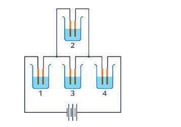 Четыре электролитические ванны с медными электродами и водным раствором CuSO4 включены в цепь, как показано на рисунке