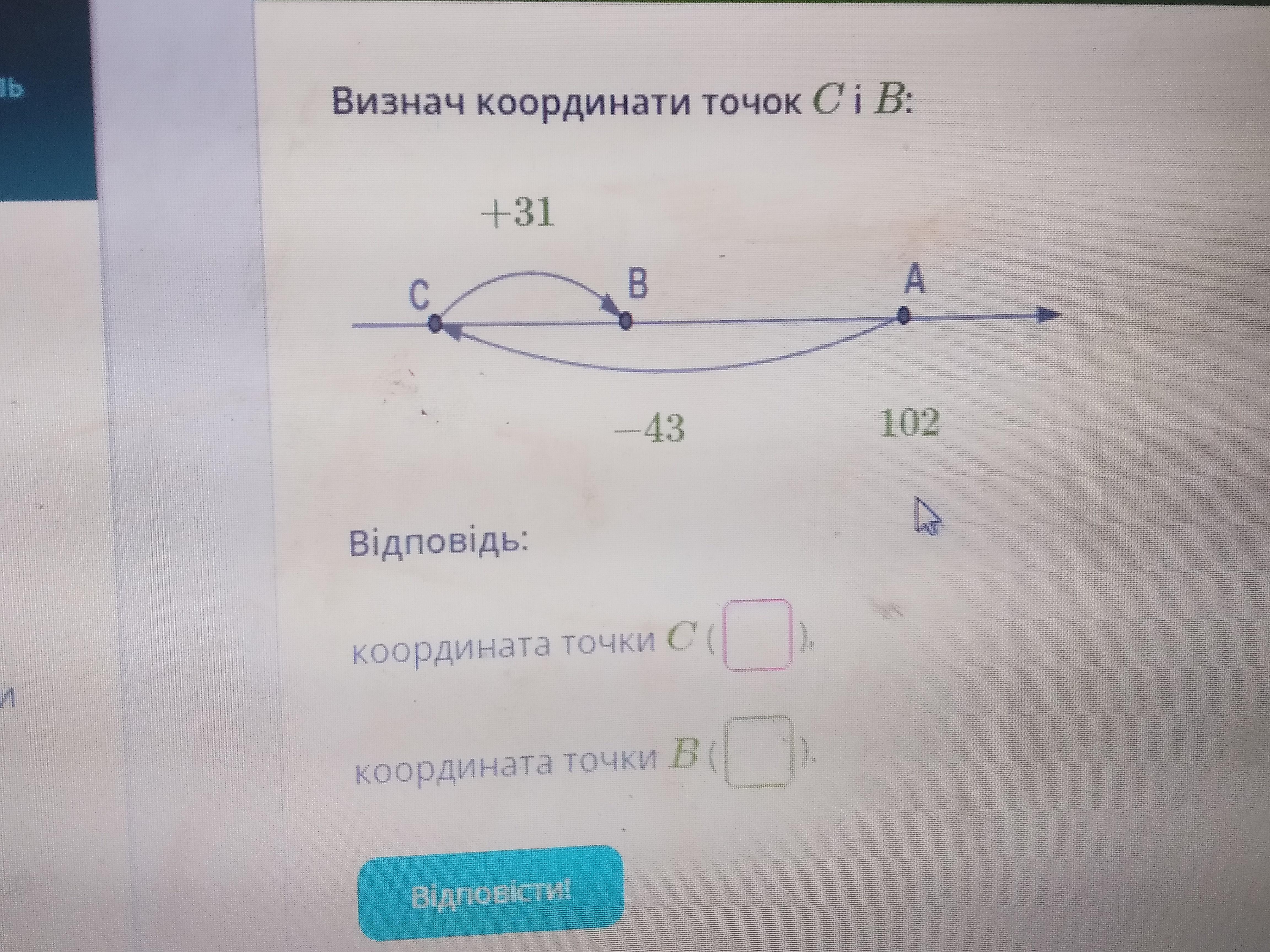 102+(-43)=102-43= 59 координата т.С(59)