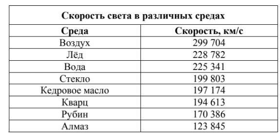 в вакууме 299 792 км/с. Пользуясь таблицей, определите, в каких средах свет пройдёт то же