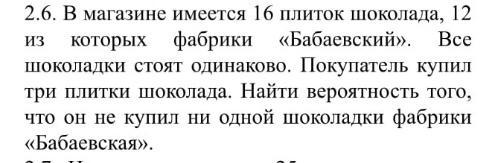 В магазине имеется 16 плиток шоколада, 12 из которых фабрики "Бабаевская". Все шоколадки стоят одинаково. Покупатель купил 3 плитки шоколада. Найти вероятность того, что он не купил ни одной шоколадки фабрики "Бабаевская".