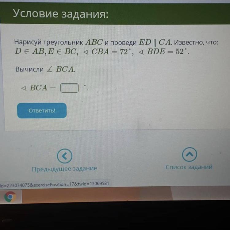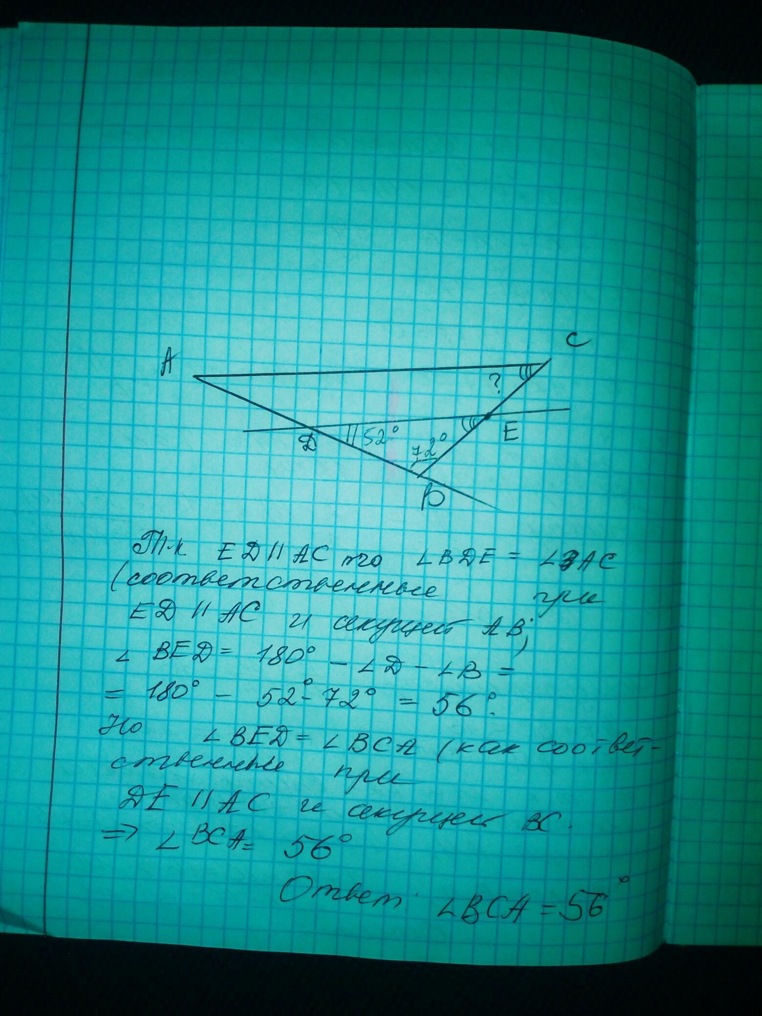 Нарисуй треугольник ABC и прoведите ED параллельно CA. Известно, что D принадлежит AB, Е принадлежит BC, угол CB равен 72, угол BD равен 52. Вычисли угол BCA