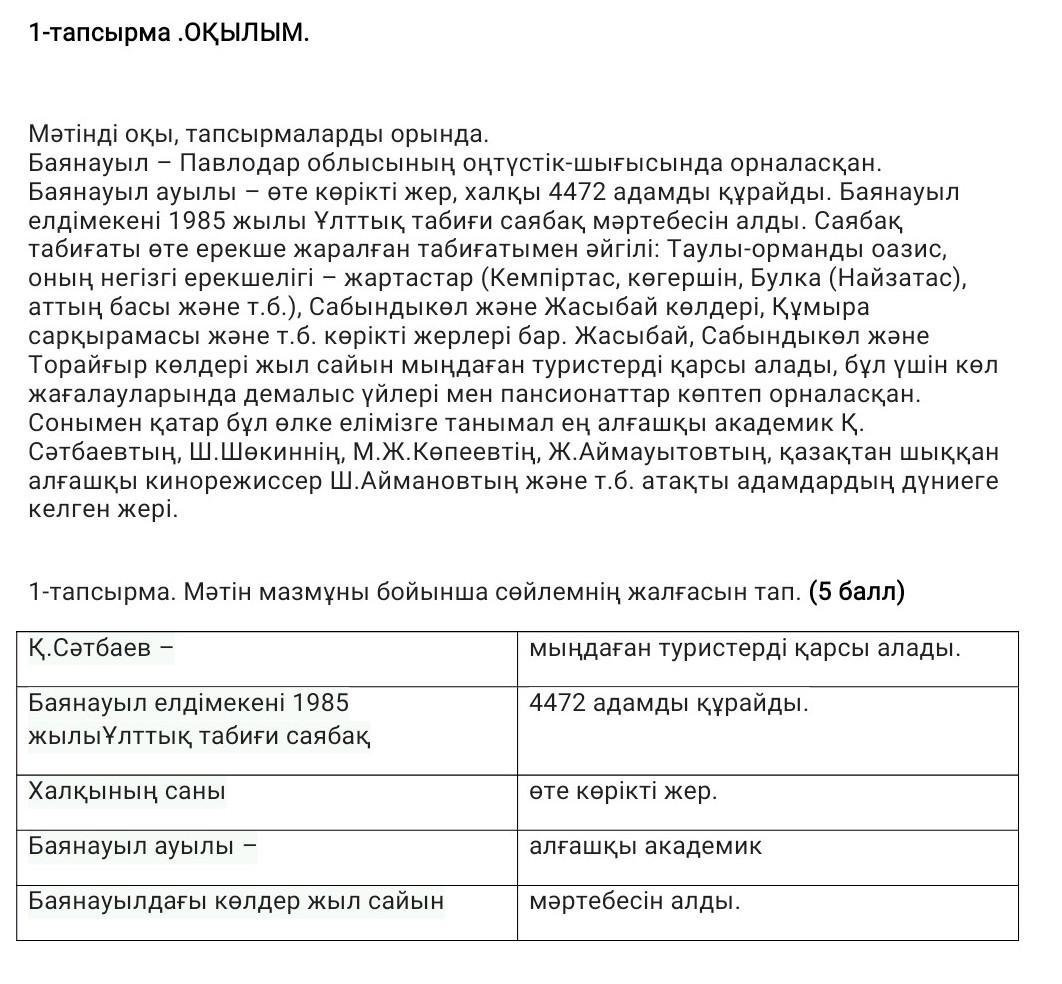 1-тапсырма. Мәтін мазмұны бойынша сөйлемнің жалғасын тап. (5 балл)