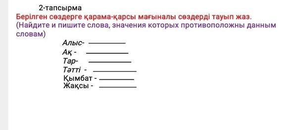 Берілген сөздерге қарама-қарсы мағыналы сөздерді тауып жаз. (Найдите и пишите слова, значения которых противоположны данным словам)