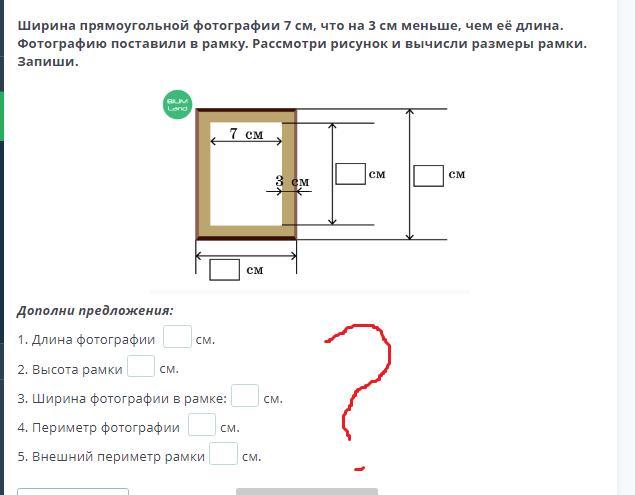 Ширина прямоугольной фотографии 7 см, что на 3 см меньше, чем её длина. Фотографию поставили в рамку. Рассмотри рисунок и вычисли размеры рамки. Запиши.