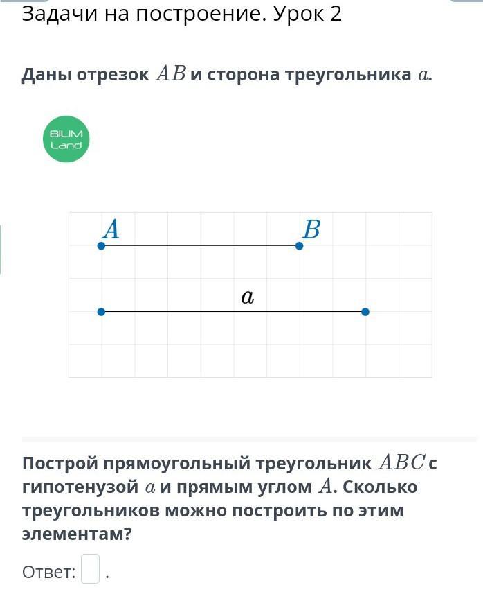 Построй прямоугольный треугольник ABC с гипотенузой a и прямым углом A. Сколько треугольников можно построить по этим элементам?