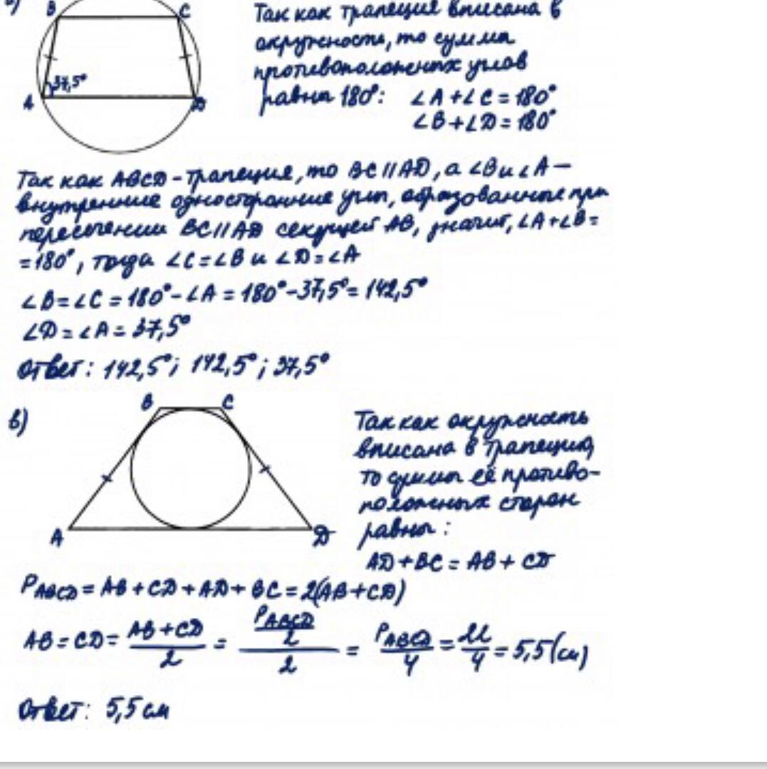 1. Решите задачу с помощью теорем о вписанных и описанных четырехугольниках А) Один из углов трапеции, вписанной в окружность , равен 37,50. Найдите остальные углы трапеции. В) Периметр равнобедренной трапеции , описанной около окружности , равен 22 см. Найдите величину боковой стороны трапеции.