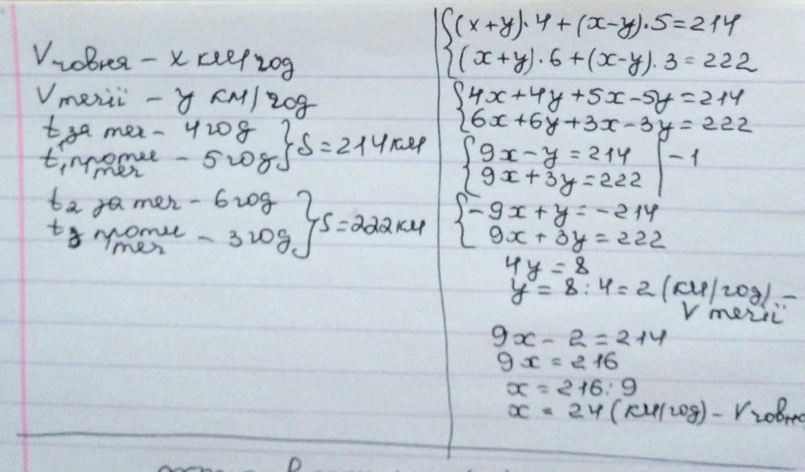 За 4 год за течією і 5 год проти течії човен пройшов 214 км, а за 6 год за