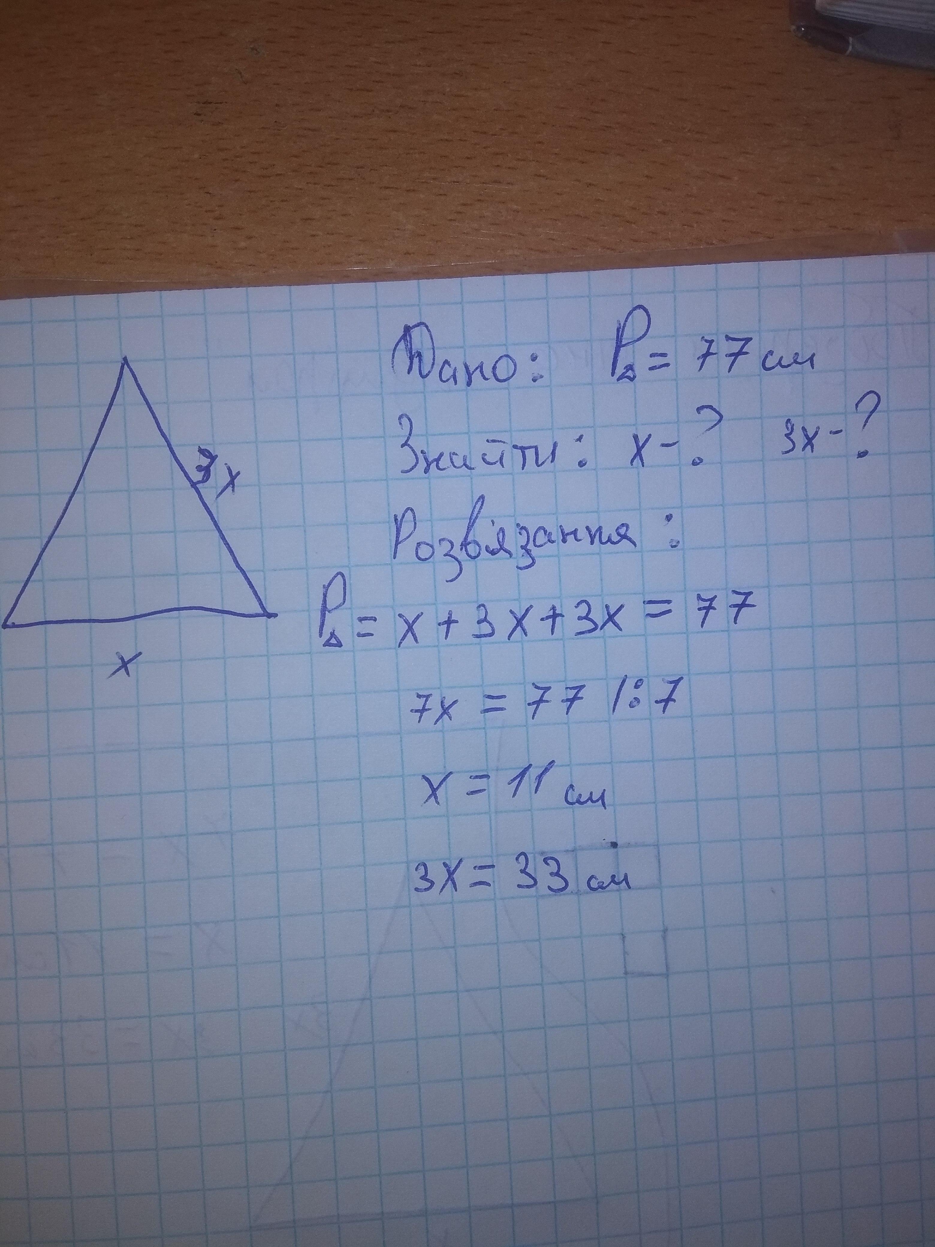 Бічна сторона рівнобедреного трикутника втричі більша за його основу. Знайдіть сторони його трикутника, якщо його периметр дорівнює 77см.