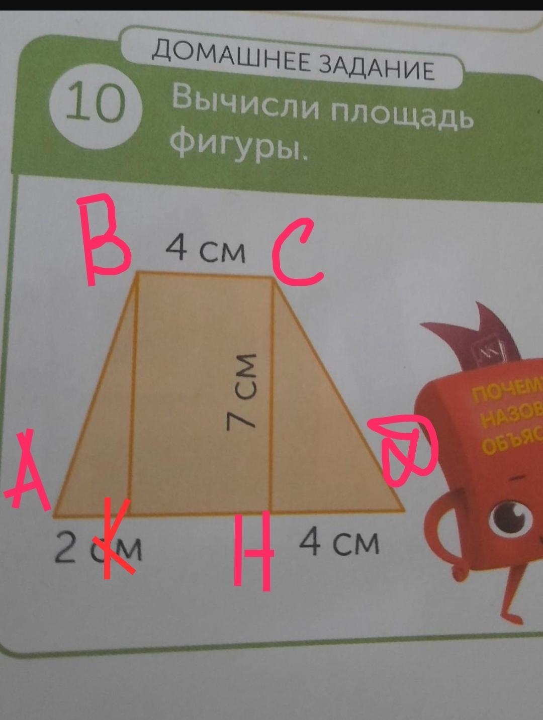 Данная фигура является трапецией, обозначим её вершины А, В, С, Д, а 2 высоты СН и ВК. СН и ВК делят АД так, что КН=ВС=4см, тогда