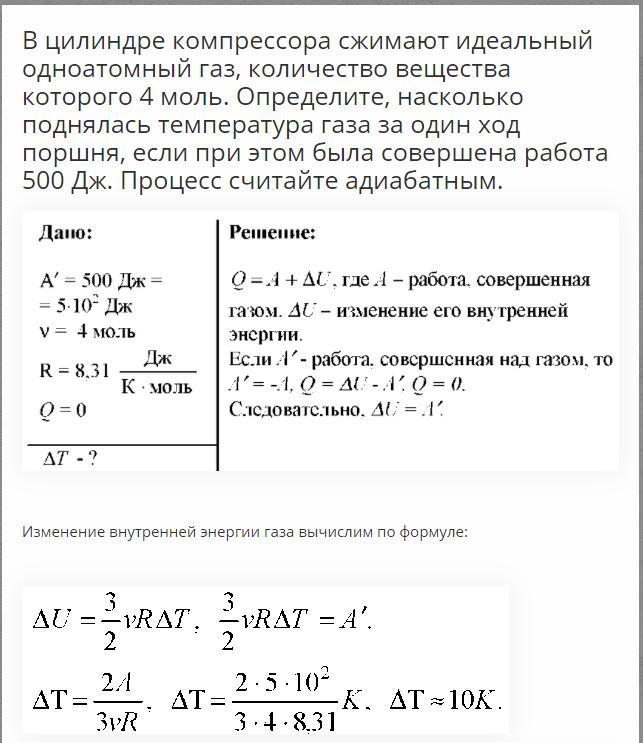 У циліндрі компресора стискають 4 моля ідеального одноатомного газу. На скільки збільшилася температура газу, якщо була здійснена робота 500 Джоулів? Процес вважати адіабатним.Відповідь дати в градусах Кельвіна з точністю до цілих.Ввести лише число без жодних розмірностей.