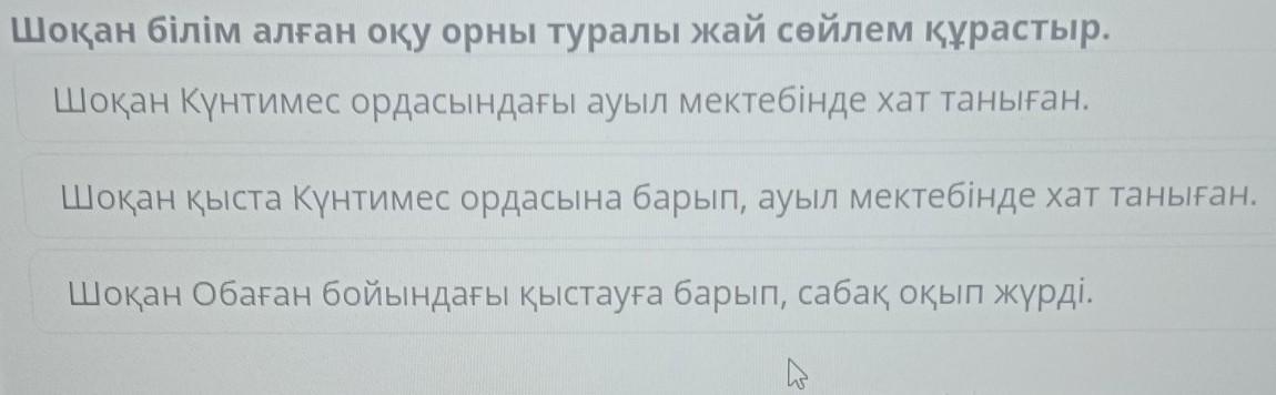 Жәй сөйлем: Шоқан Күнтимес ордасындағы ауыл мектебінде хат таныған.