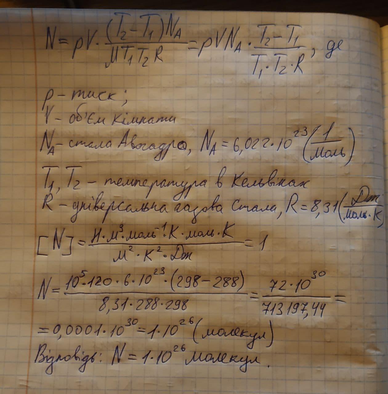 3. Яка кількість молекул повітря виходить з кімнати об'ємом 120 м3 при підвищенні температури з 15 до 25 С. Атмосферний тиск нормальний.