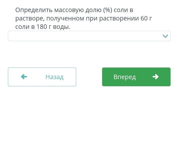 Определить массовую долю (%) соли в растворе, полученном при растворении 60г соли в 180г воды.