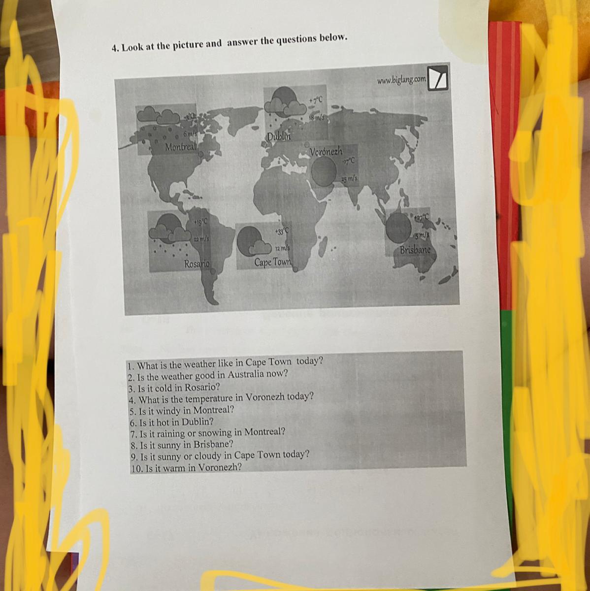 Там где написан Воронеж не видно какая температура если там написана +7 тогда в 4 вопросе поставьте +7° если другое то вместо +7° поставьте то число которое там стоит