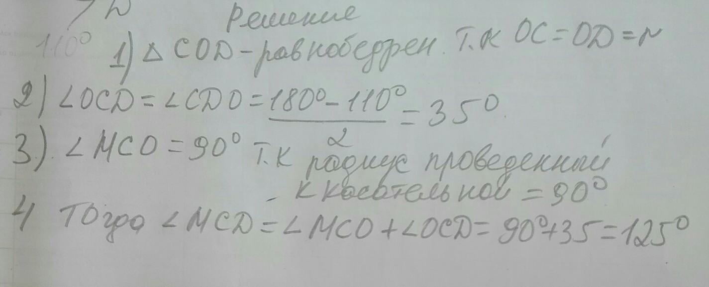 через точку С окружности, проведена касательная МN и хорда CD.Чему ровна градусная мера угла МСD, если угол COD=110°.