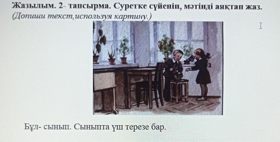 Жазылым. 2- тапсырма. Суретке сүйеніп, мәтінді аяқтап жаз.